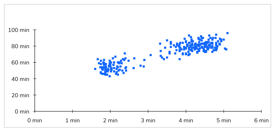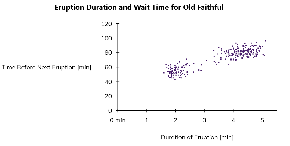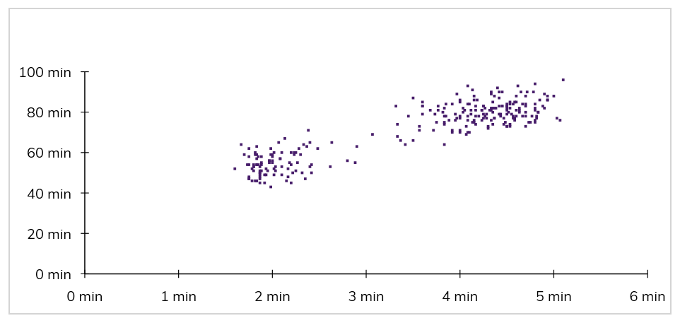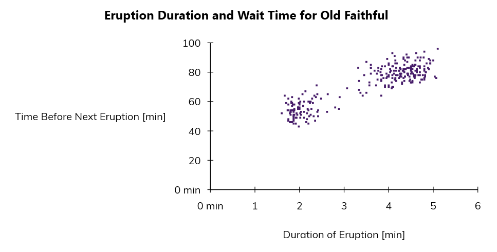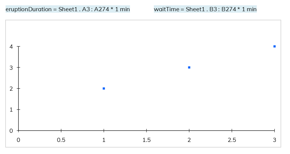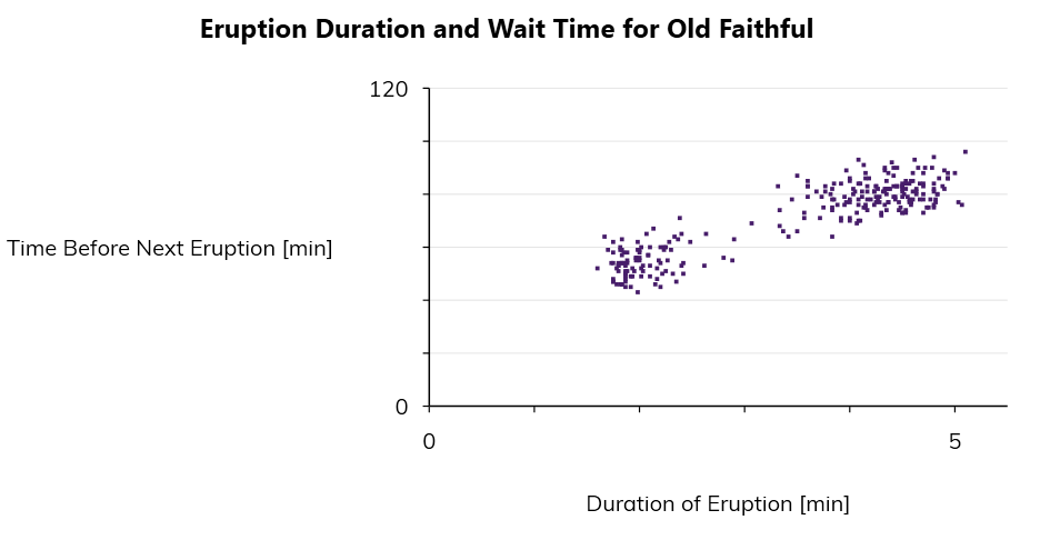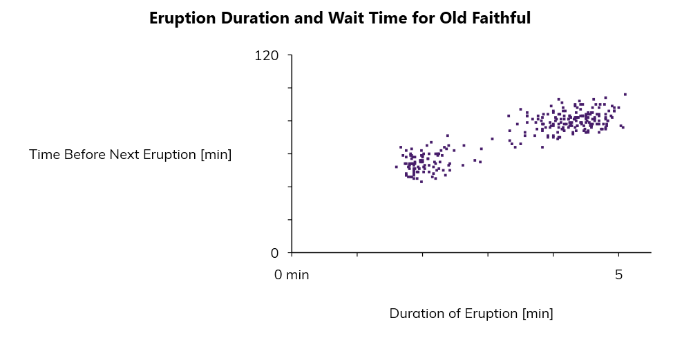 Double click the chart, and specify the x and y ranges. We want eruption duration for x, and wait time for y.