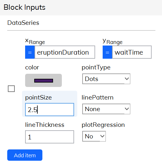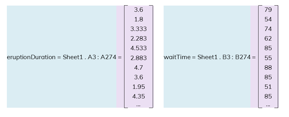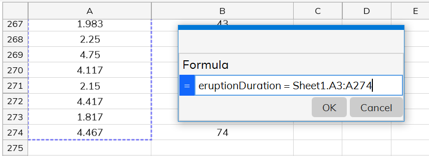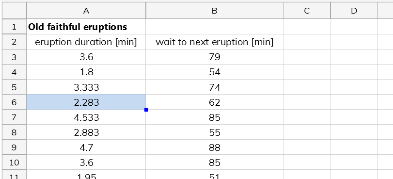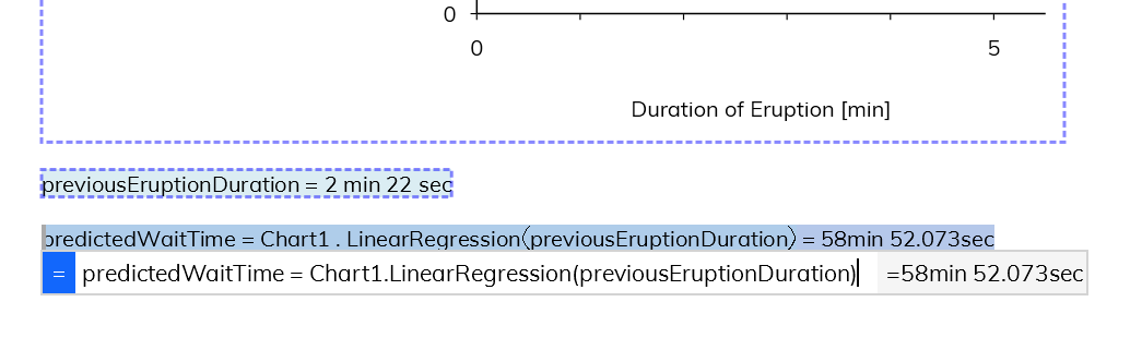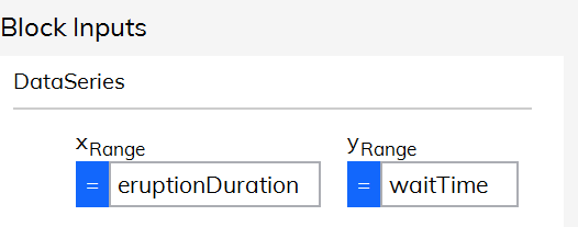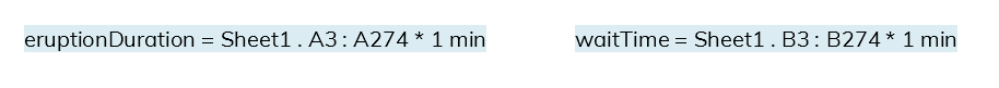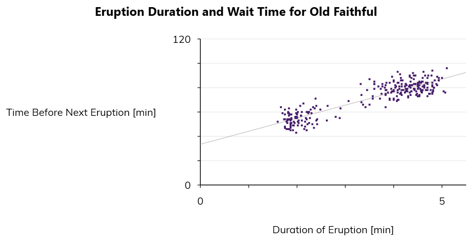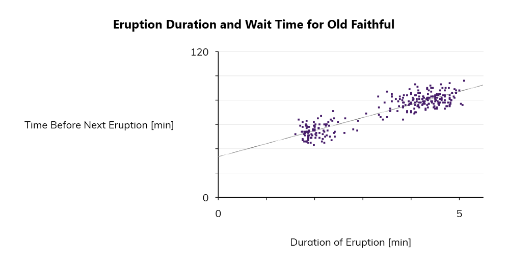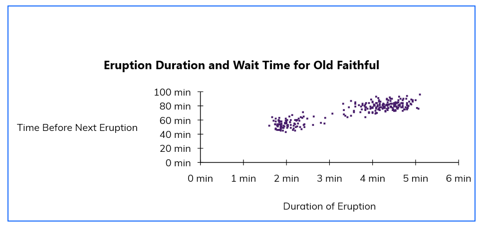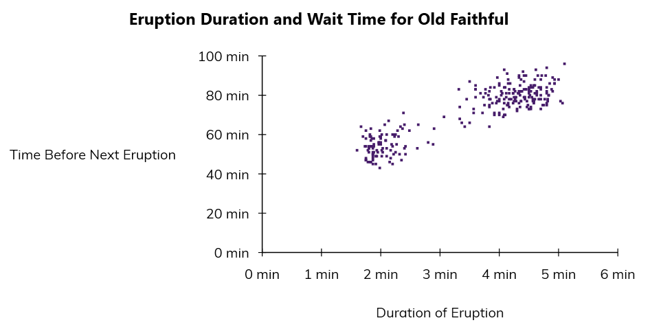 Double click the chart, and specify the x and y ranges. We want eruption duration for x, and wait time for y.