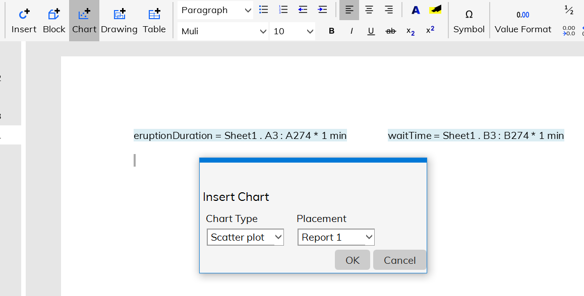 Now it's time to insert the scatter plot. Click the insert chart button in the toolbar, choose the report you're working in for placement, and click OK.